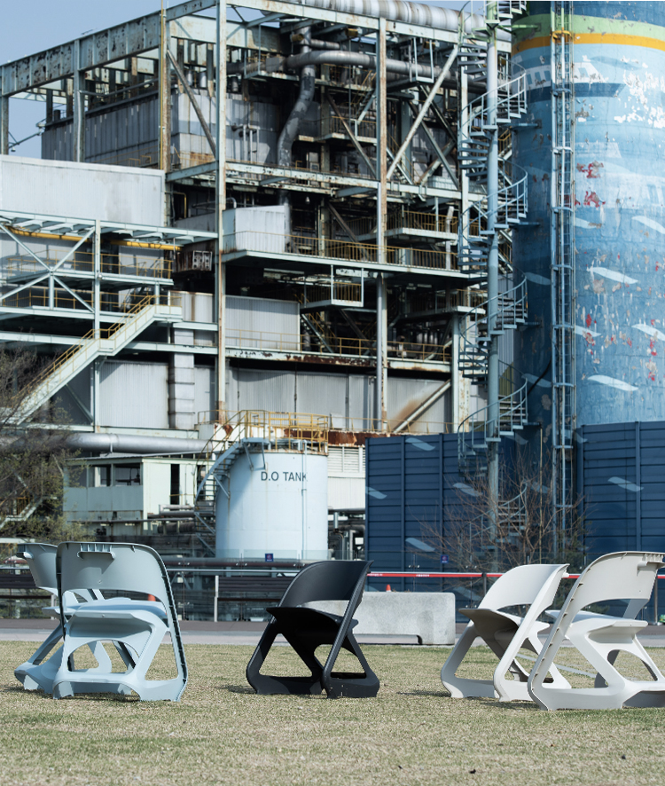 의자를 들 필요 없이 밀어서 포갤 수 있도록 새로운 관점의 구조로 완성한 의자입니다.